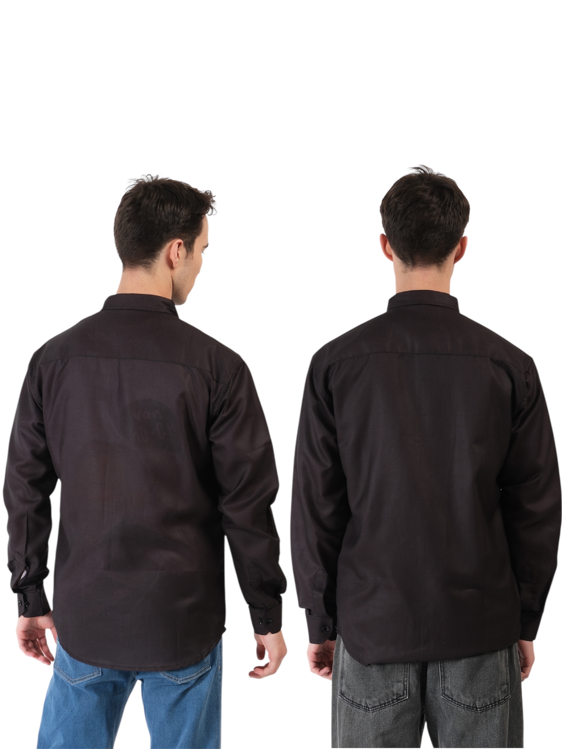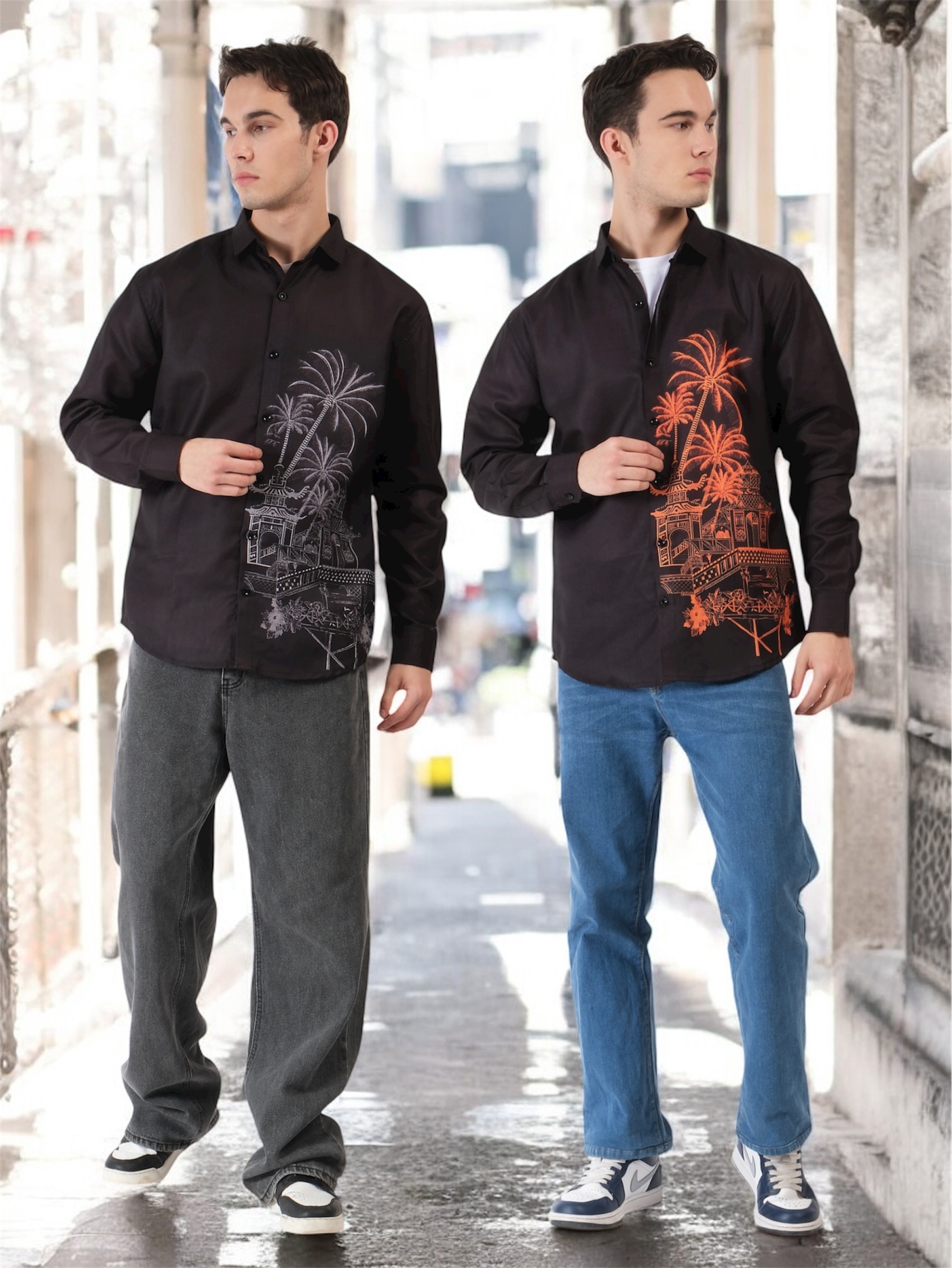 Step into refined sophistication with the Twilight Pavilion Duo, a pair of Klevenchy Classic Full-Sleeve shirts designed for the modern gentleman. Both crafted in luxurious rayon, these shirts drape effortlessly, offering unmatched softness and breathability. The deep charcoal canvas is brought to life with a striking pavilion-and-palm motif — rendered in soft silver on one shirt for a calm, understated vibe, and in glowing golden hues on the other for a bolder, artful statement. Together, they embody the perfect balance of serenity and drama, making them versatile staples for evenings that call for subtle sophistication.